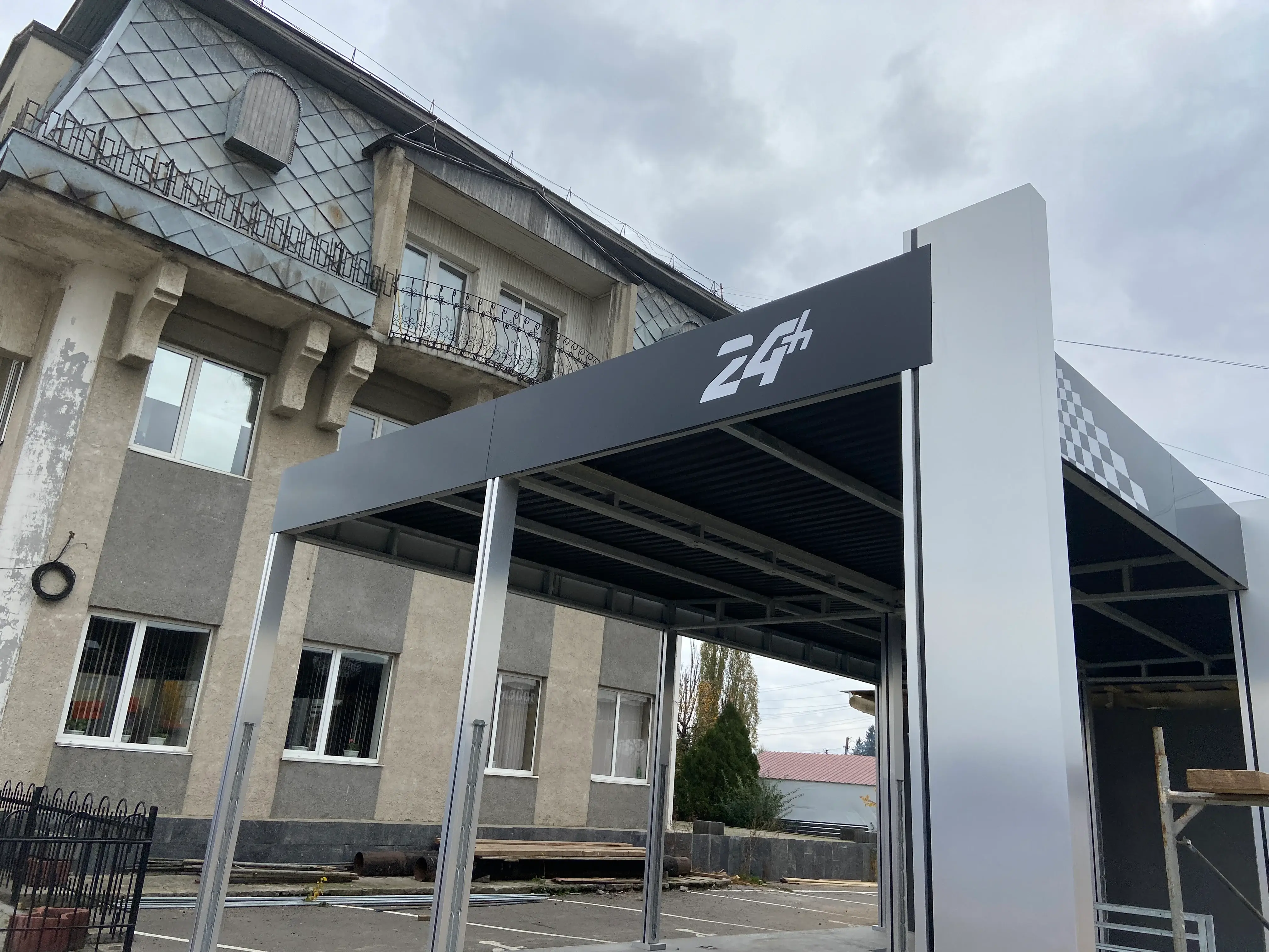 Унікальний власний дизайн. Дана конструкція виконана з нержавіючого круглого каркасу, на даху литий полікарбонат, оздоблена конструкція композитним матеріалом товщиною 4 мм фірми Alubond та підсвіткою.