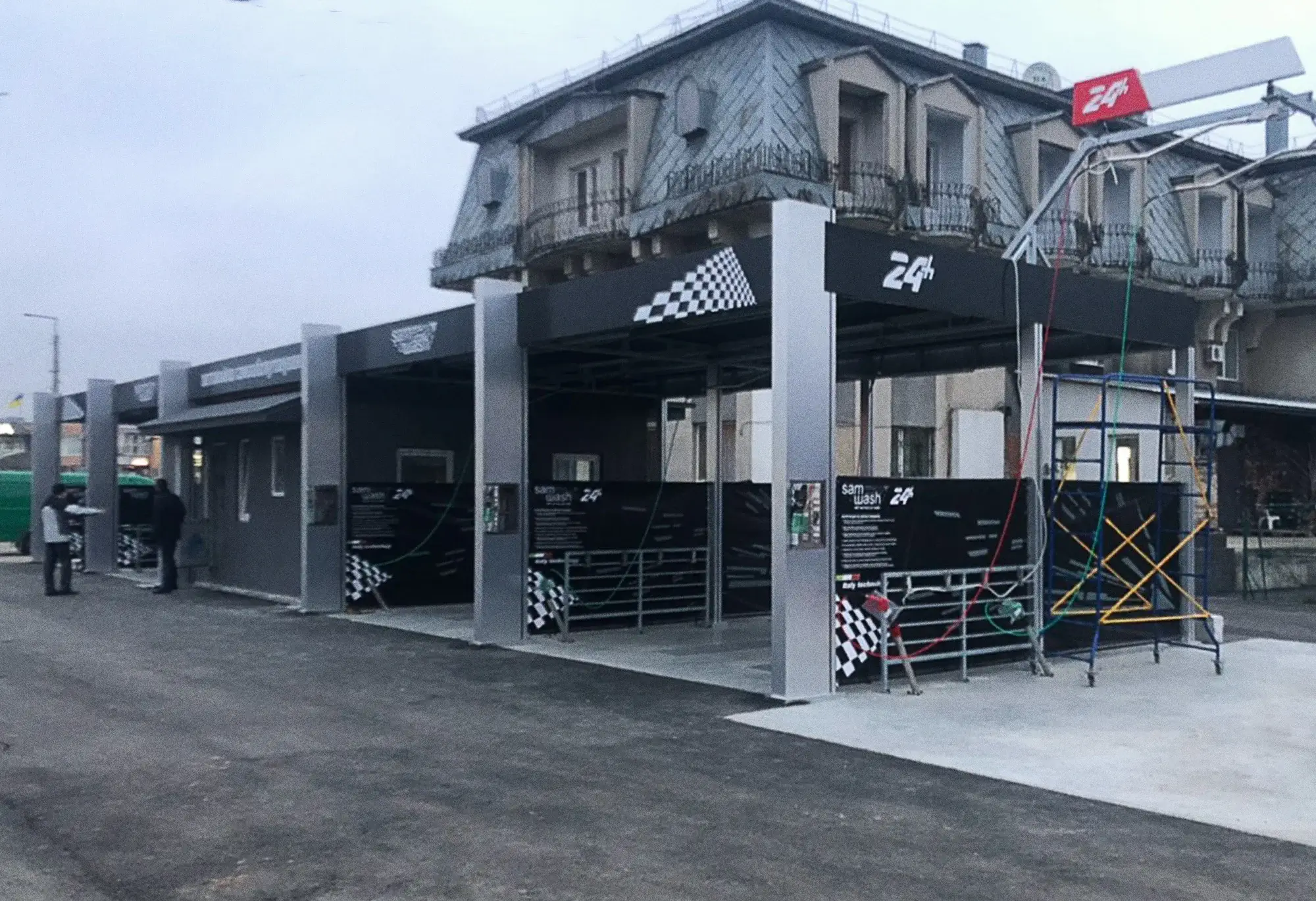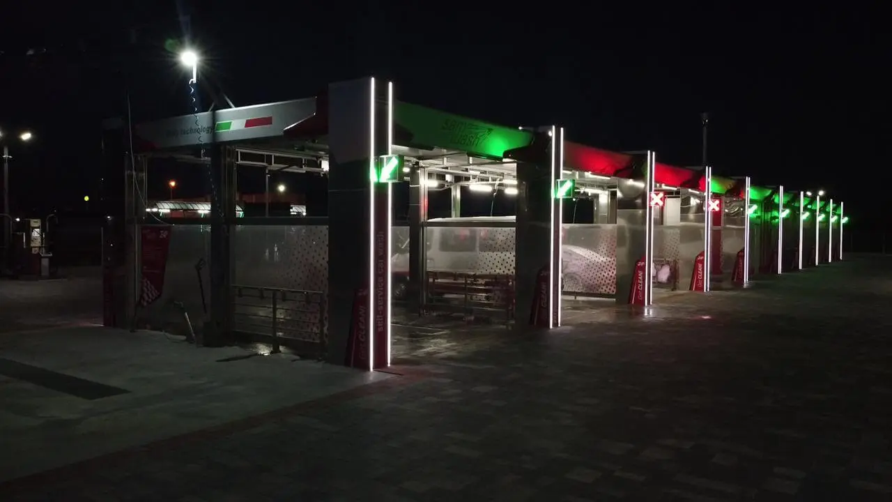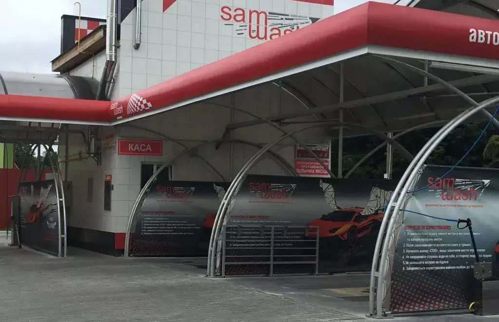Дизайн цієї конструкції повністю обшитий листовою нержавіючою сталлю А - 304, перегородки між мийними постами виконані з гартованого 10 мм скла, тому надзвичайно привабливий для клієнта. Даний каркас виконаний методом гарячого цинкування, а на даху встановлені сендвіч панелі 100 мм. Атіка виконана композитним матеріалом товщиною 4 мм фірми Alubond з підсвіткою.