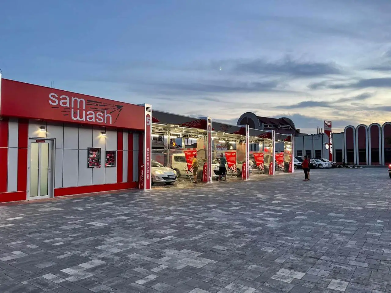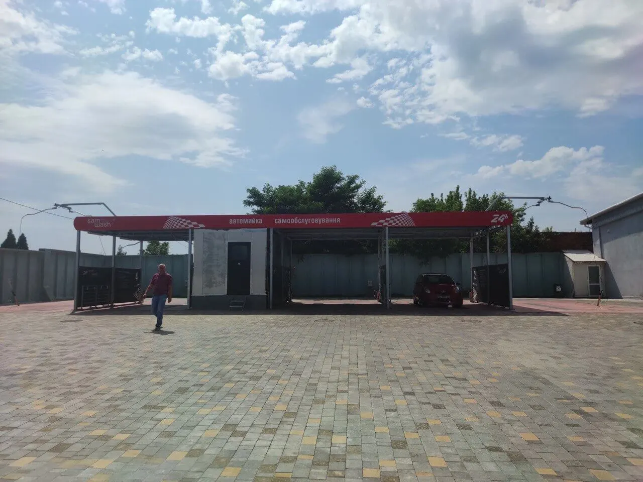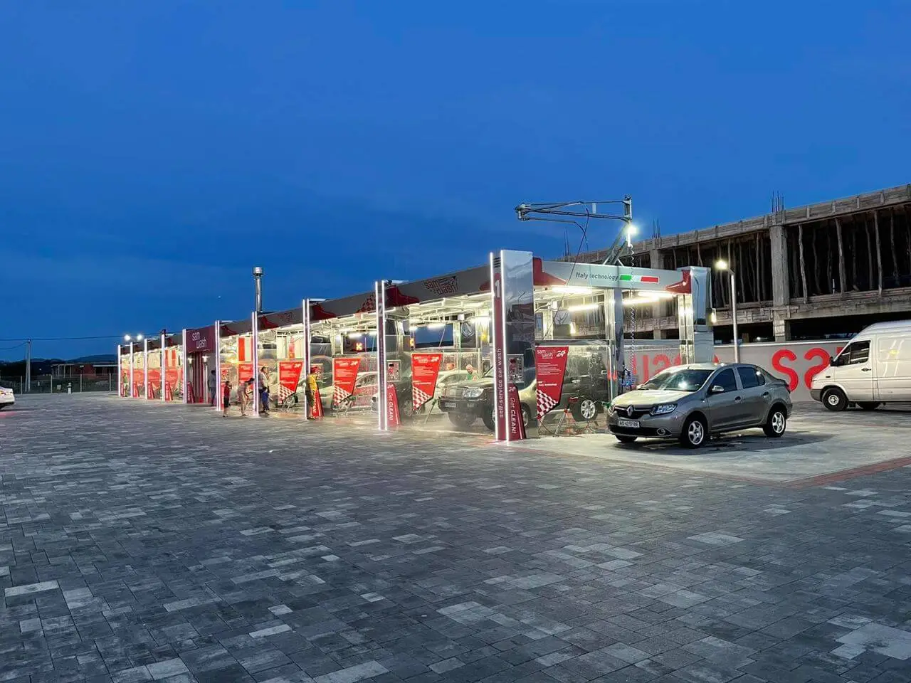 Дизайн цієї конструкції повністю обшитий листовою нержавіючою сталлю А - 304, перегородки між мийними постами виконані з гартованого 10 мм скла, тому надзвичайно привабливий для клієнта. Даний каркас виконаний методом гарячого цинкування, а на даху встановлені сендвіч панелі 100 мм. Атіка виконана композитним матеріалом товщиною 4 мм фірми Alubond з підсвіткою.